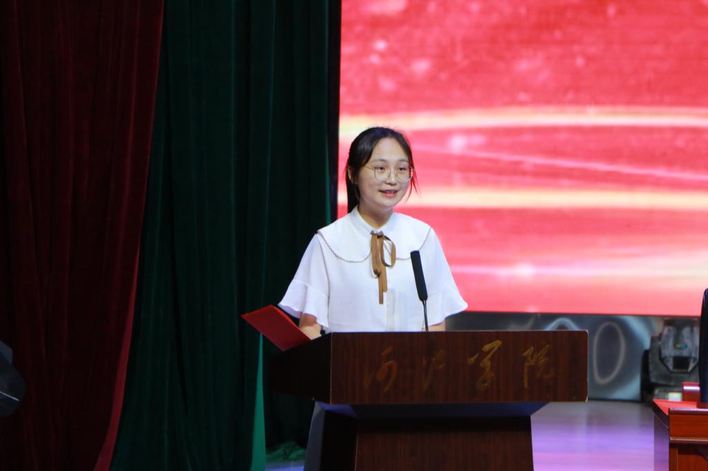 本次会议由郭英莉主持。会议主要有五项议程:全体起立,唱中华人民共和国国歌;教师代表赵君超老师发言;老生代表2021级学前教育专业彭慧芳发言;新生代表2023级小学语文专业A班谢易真同学发言;党委书记李新富讲话。