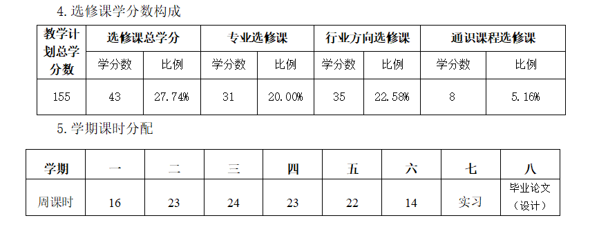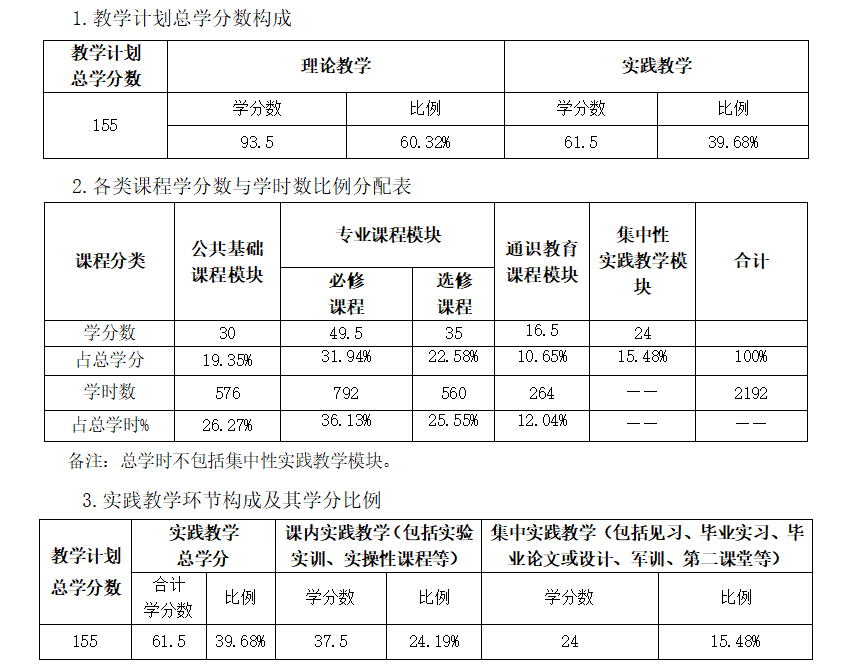 毕业学分:155学分,其中公共基础课程30学分,专业基础(核心)课程49.5学分,专业选修(方向/行业)课程35学分,集中性实践24学分,通识课程16.5学分。