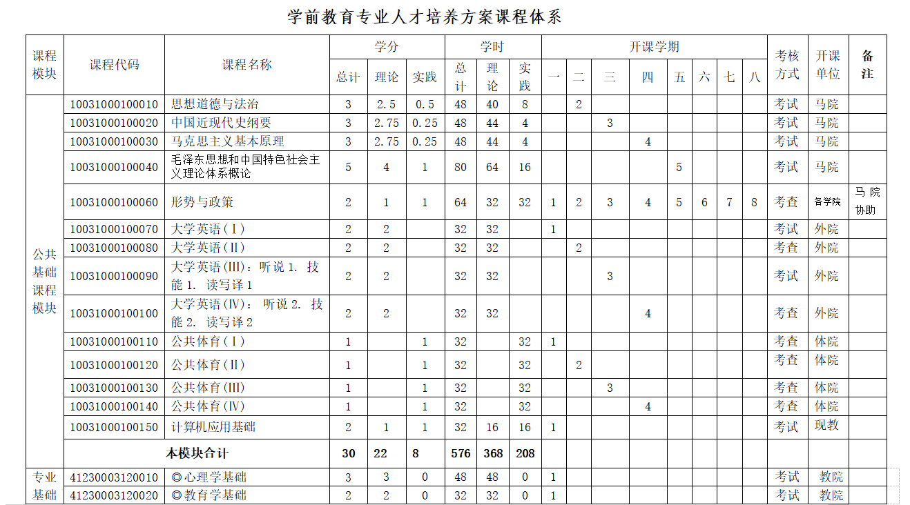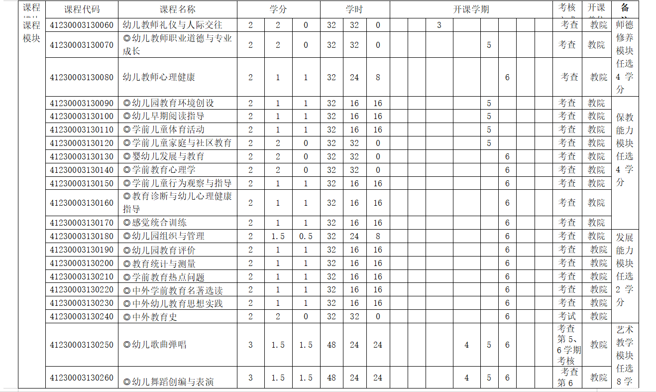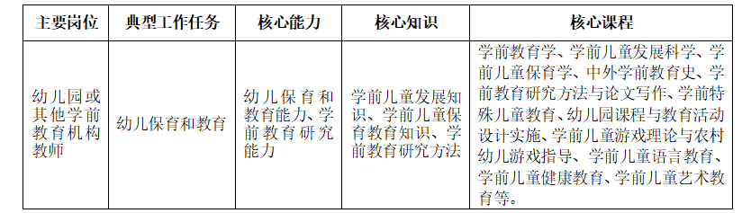 核心课程:学前教育学、学前儿童发展科学、学前儿童保育学、中外学前教育史、学前教育研究方法与论文写作、学前特殊儿童教育、幼儿园课程与教育活动设计实施、学前儿童游戏理论与农村幼儿游戏指导、学前儿童语言教育、学前儿童健康教育、学前儿童艺术教育等。