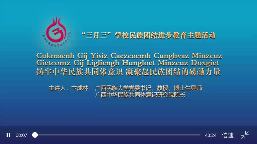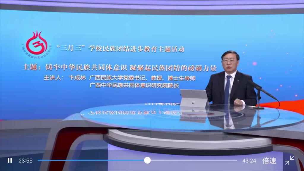 3月26日上午,必赢3003no1线路检测中心开展“三月三”学校民族团结进步教育主题活动。本次活动以线上直播的方式进行,由广西民族大学党委书记、教授、博士生导师卞成林主讲。教院全体学生通过网络直播参与了本次主题活动。