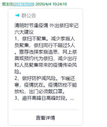 4月4日举行全国哀悼日,恰逢也是清明节,是个深切哀悼逝世亲人、缅怀先烈的日子。4月4日10点起全国人民共同哀悼3分钟,禁止鸣笛防空警报长鸣。在校教师及未返校师生响应国务院号召,积极参与本次哀悼活动,以此表达对全国各族同胞在抗击新冠肺炎斗争中的无私奉献和对逝去的同胞深深的哀悼之情。此外,同学们还响应学校团委号召,登录“致敬·2020清明祭英烈”云祭祀互动平台,为先烈们线上献花。同时,为了引导同学们在清明期间继续做好疫情防控工作,各班班主任还在班群里提醒同学们注意外出祭祀需要牢记的六大建议,包括出门务必戴好口罩,不扎堆,不聚集等内容。
