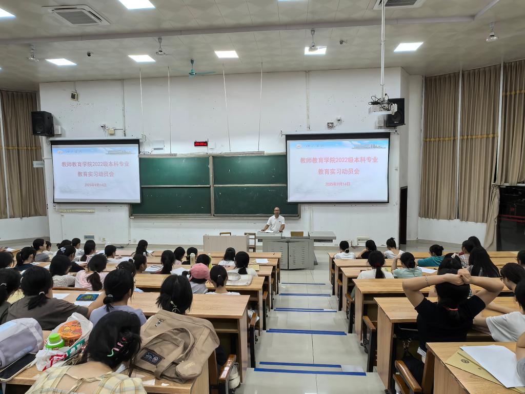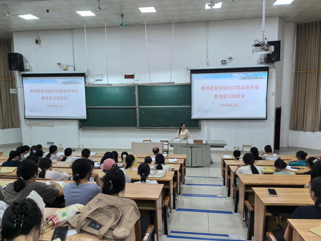 根据专业人才培养方案要求,2022级小学教育和学前教育本科专业学生将于2025年9月15日至12月26日开展为期近一个学期的教育实习。为切实做好2026届本科生实习工作,明确实习要求,强化实习纪律,9月14日晚,我院在弘毅楼1-101教室召开教育实习动员大会。教学副院长樊仲光主持会议,党委副书记郭英莉、学前教育系主任朱云老师、初等教育系主任李群兰老师出席会议,并分别就安全纪律、专业实习任务进行讲话,全体实习带队老师和实习生参加动员会。