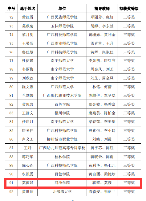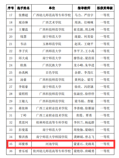 根据自治区《关于2024年全区师范生教学技能大赛获奖人员名单的公示》文件精神,我院21学前邱紫蓉在全区师范生教学技能大赛中荣获一等奖,小数23A莫茵显在全区师范生教学技能大赛中荣获三等奖。