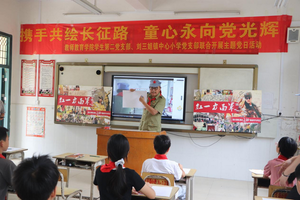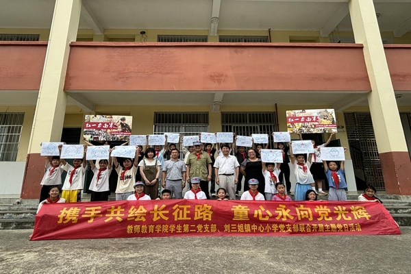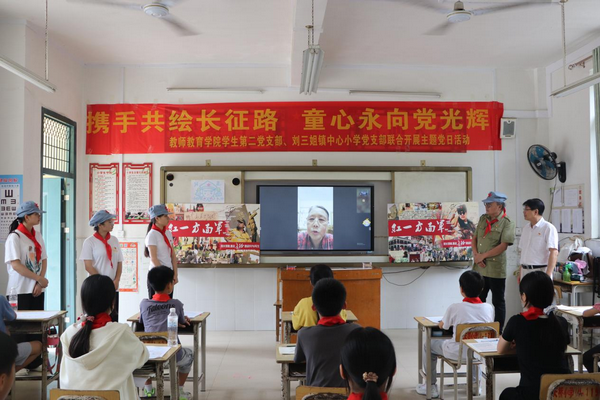 5月28日,必赢3003no1线路检测中心必赢3003no1线路检测中心学生第二党支部与刘三姐镇中心小学党支部联合开展“携手共绘长征路 童心永向党光辉”的主题党日活动。学院党委书记李新富、我校银龄教授刘增宪、学生第二党支部书记韦雅文及部分学生党员到场参加了活动。